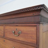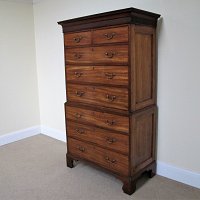This is a late 18th century (c.1780) Georgian mahogany and cherrywood provincial chest on chest. The chest stands on its original bracket feet. The lower section is fitted with three long drawers and the top section has three long and two short drawers. The drawers retain their original brass swan neck handles and have the original blue lining paper to the drawer bottoms. The side of the chest on chest are of panelled construction and are constructed in cherrywood. It is not uncommon to see different types of wood used on provincial pieces of furniture, although mahogany and cheerywood is an unusual combination. The drawer front colour has mellowed with age and compliments the warm honey colour of the cherrywood very well. The chest is topped with a mahogany moulded cornice that is decorated with a greek key motif. The chest on chest is in excellent clean and original condition with only very minor marks and bruises, commensurate with age and usage.