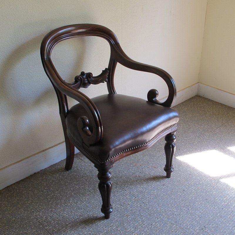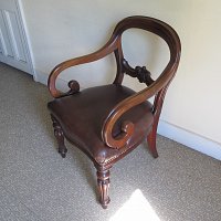 This is a mid 19th century (c.1860) mahogany balloon back desk chair. The chair has scrolled and moulded arms and stands on turned front legs. The back has a central carved rail, decorated with scrolls and stylized leaves. The seat has been re-upholstered in dark tan leather, finished with a traditional close dome-topped nail edge. The chair is excellent quality throughout, with only very minor marks through usage, commensurate with age.