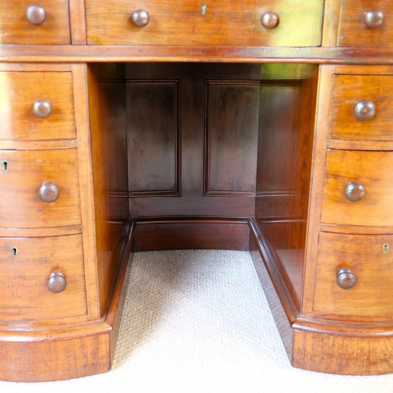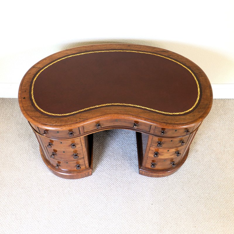 This is a rare mid 19th century (c.1850) mahogany kidney shaped ladies kneehole writing desk of small proportions. The desk stands on a plinth base and consists of an arrangement of nine graduated drawers, fitted around a central kneehole. The drawers retain their original turned knob handles. The desk is fitted with a replacement maroon gilt tooled leather writing surface. The desk is of the finest quality and exhibits a rich warm colour. The desk is in excellent condition with only very minor blemishes, commensurate with age and usage.